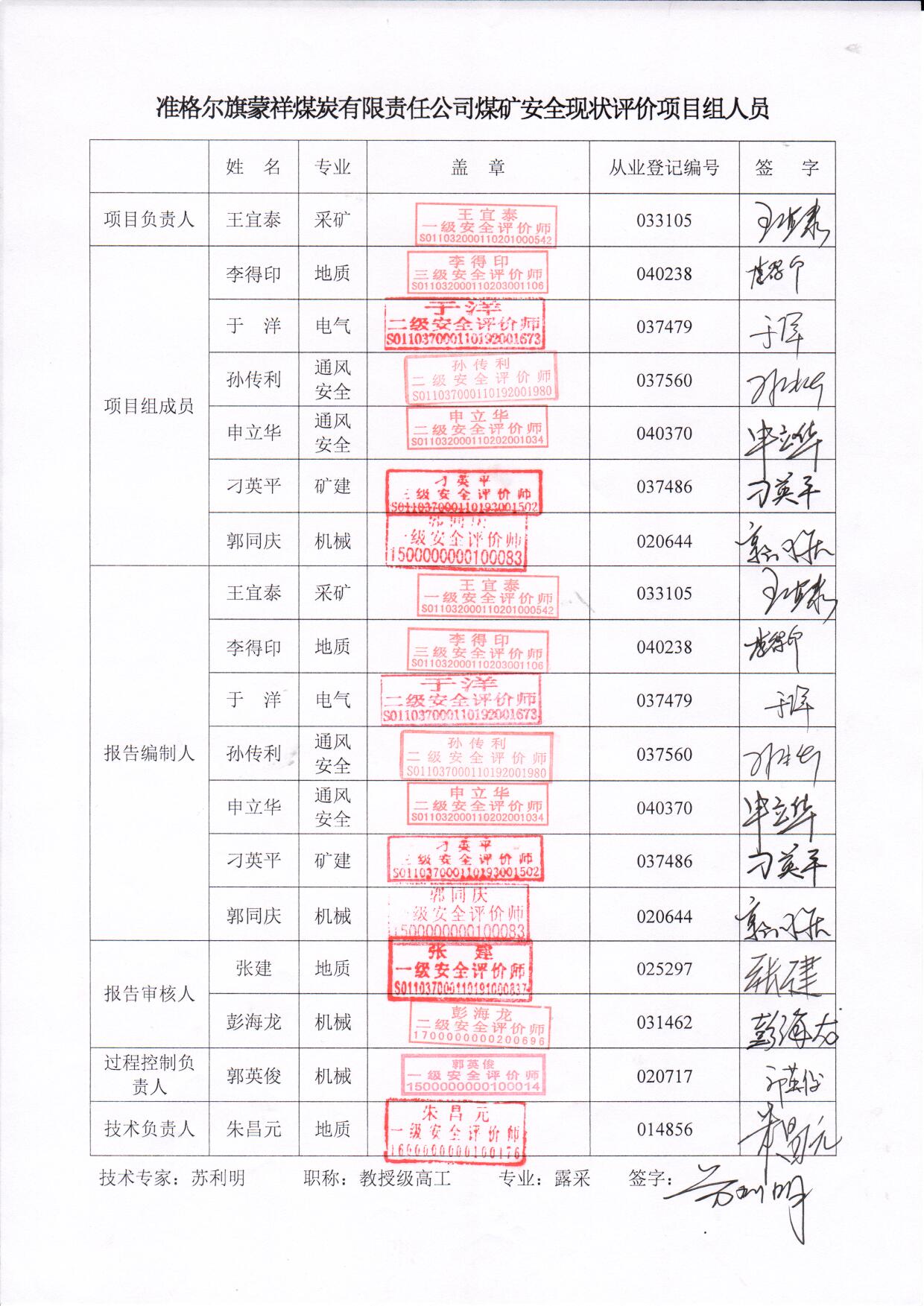 參與安全評價(jià)工作的安全評價(jià)師: 王宜泰 孫傳利 申立華 郭同慶 于 洋 李得印 刁英平 | |||||||