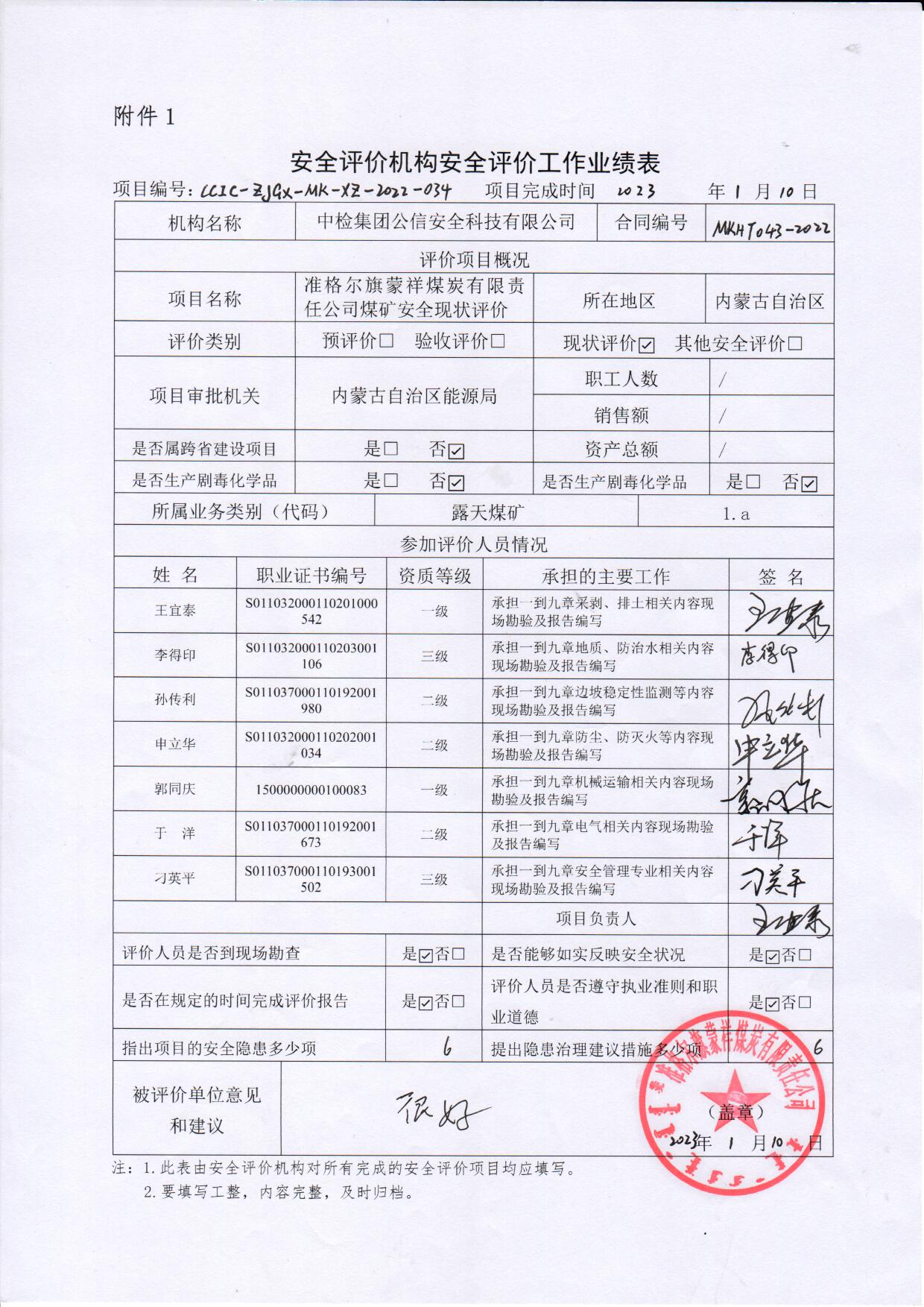 現(xiàn)場開展安全評價(jià)工作的人員、時(shí)間及主要任務(wù): 王宜泰 孫傳利 申立華 郭同慶 于 洋 李得印 刁英平 于2022年12月23日到現(xiàn)場進(jìn)行調(diào)查、搜集資料,進(jìn)行現(xiàn)場評價(jià)。 王宜泰 申立華 于2022年12月27日到現(xiàn)場評價(jià)時(shí)存在的問題進(jìn)行了復(fù)查。 | |||||||