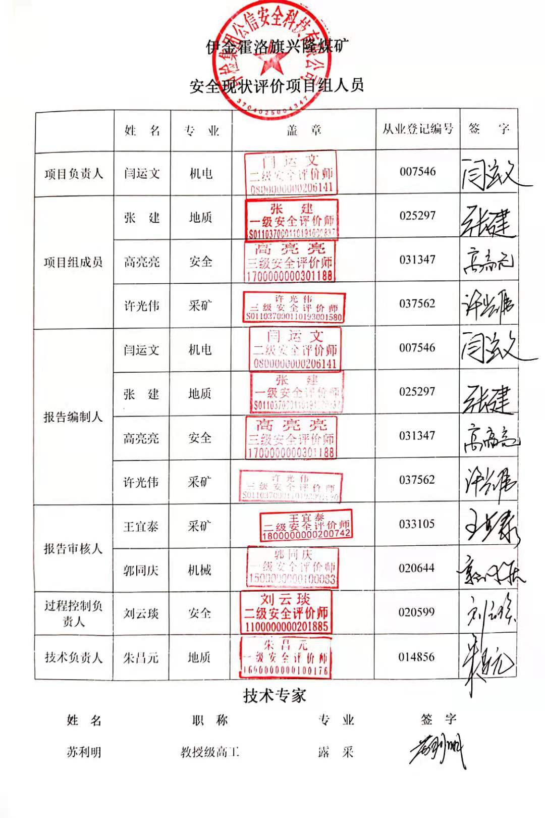 參與安全評價工作的注冊安全工程師: 閆運文 高亮亮 | |||||||