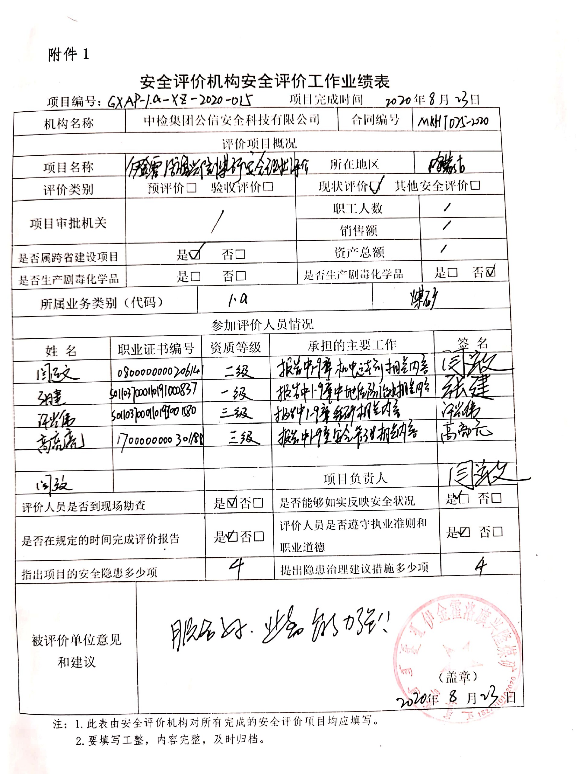 現(xiàn)場開展安全評價工作的人員、時間及主要任務: 張 建 閆運文 許光偉 高亮亮 于2020年7月9日到現(xiàn)場進行調查、搜集資料,進行現(xiàn)場評價。 于2020年8月2日到現(xiàn)場對評價時存在的問題進行了復查。 | |||||||