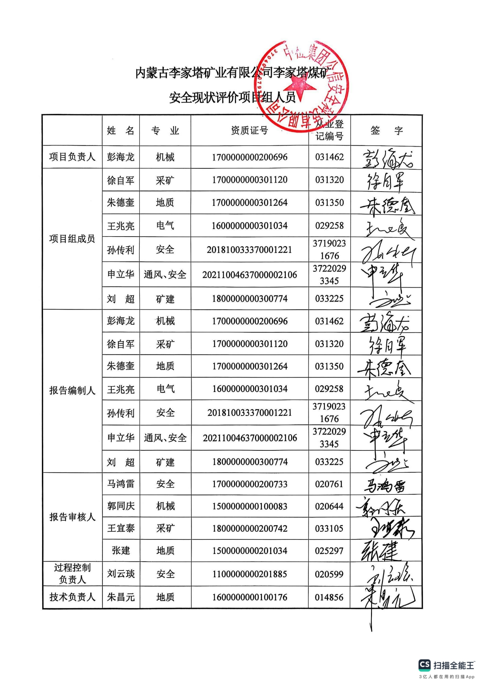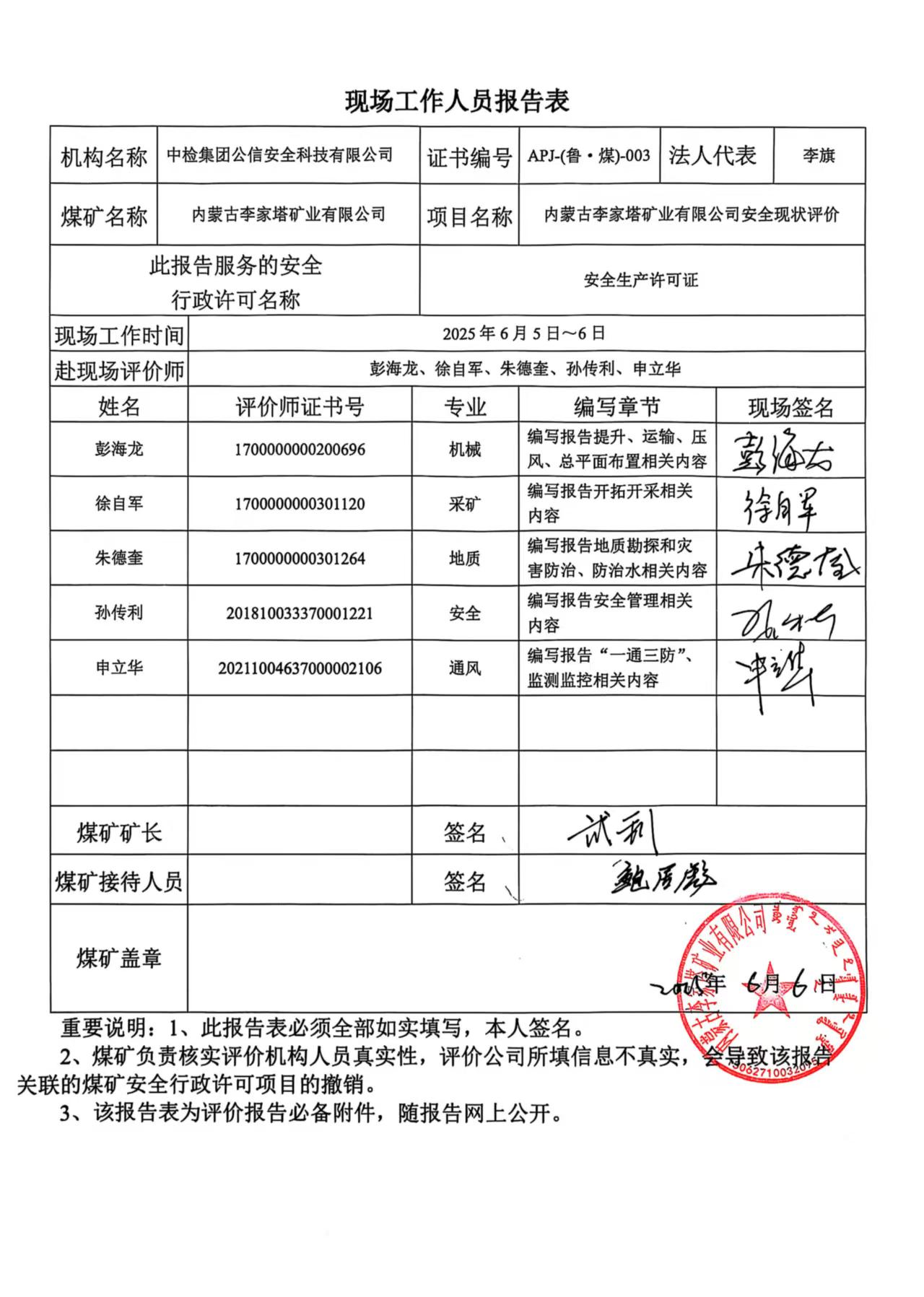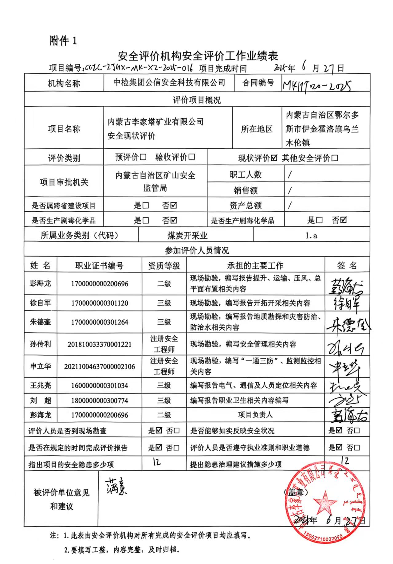 評價項目名稱 | 內蒙古李家塔礦業(yè)有限公司李家塔煤礦安全現(xiàn)狀評價 | ||||||