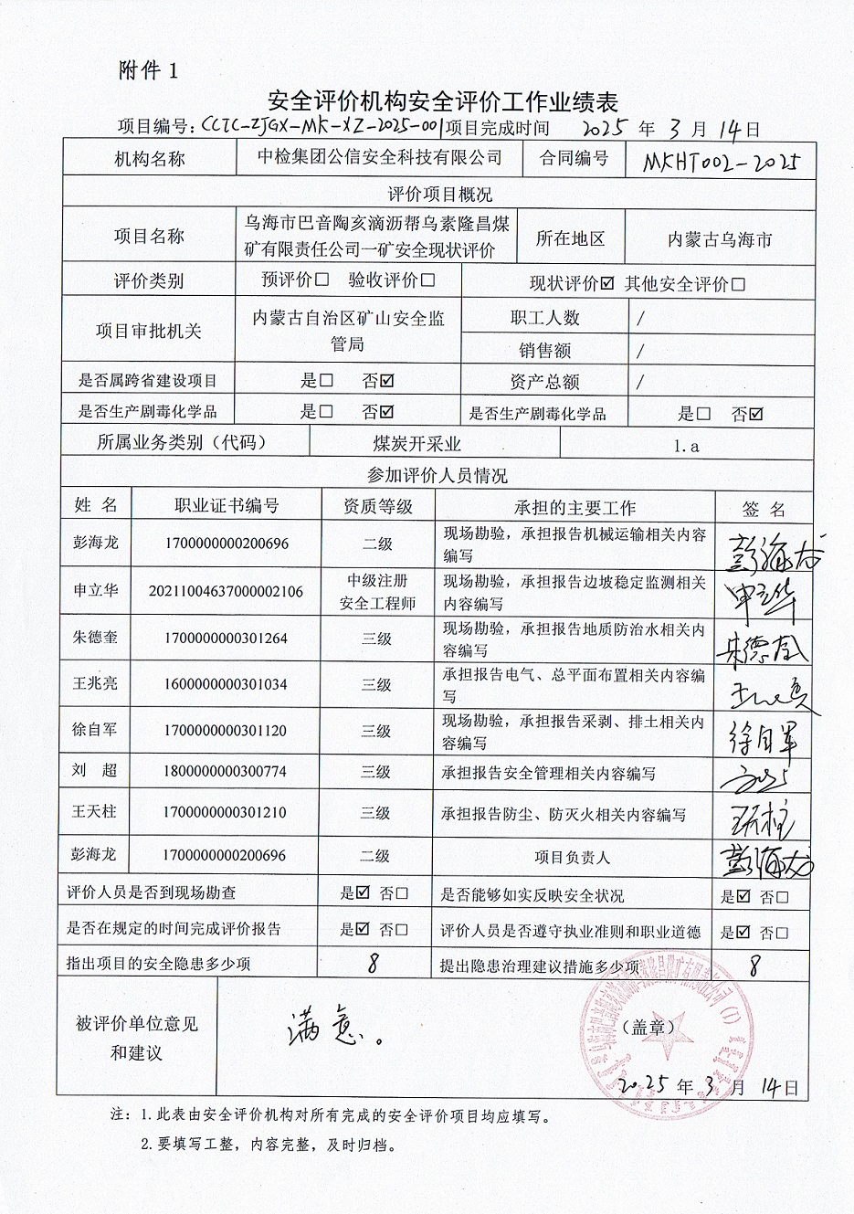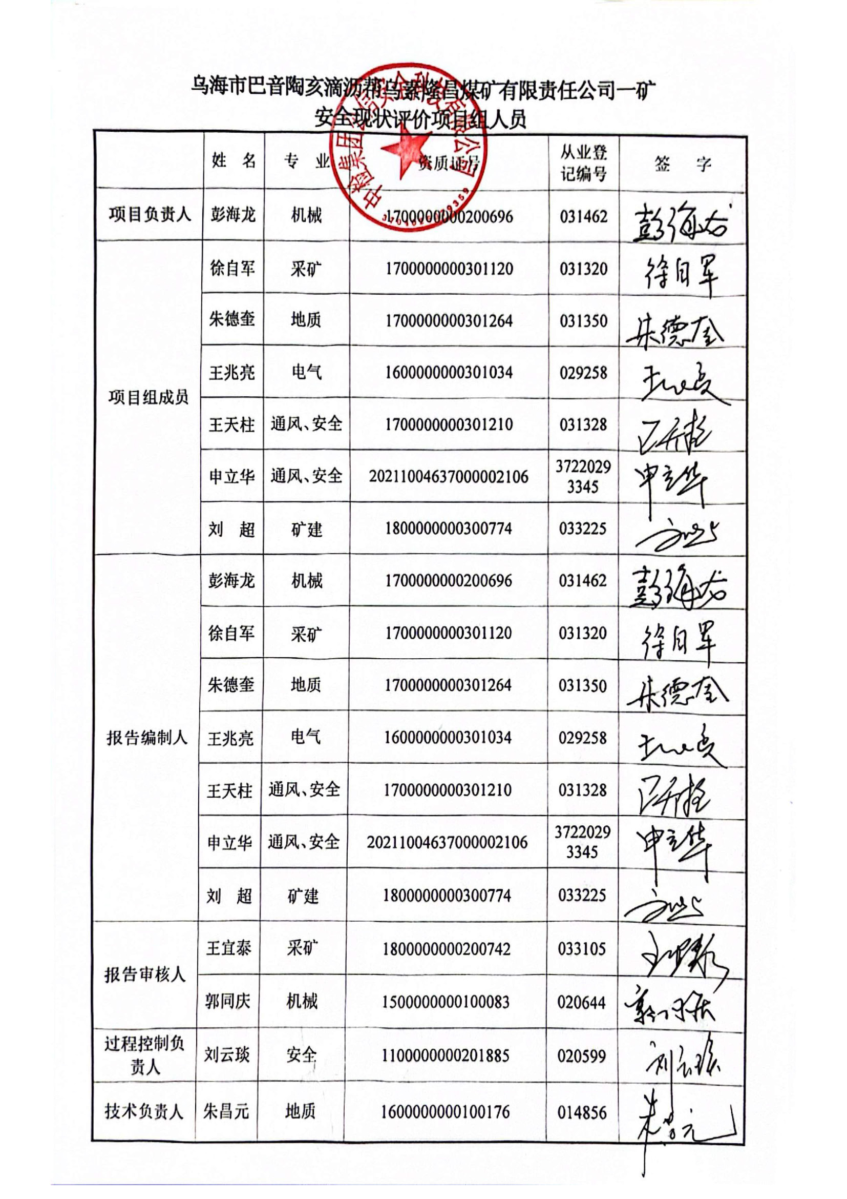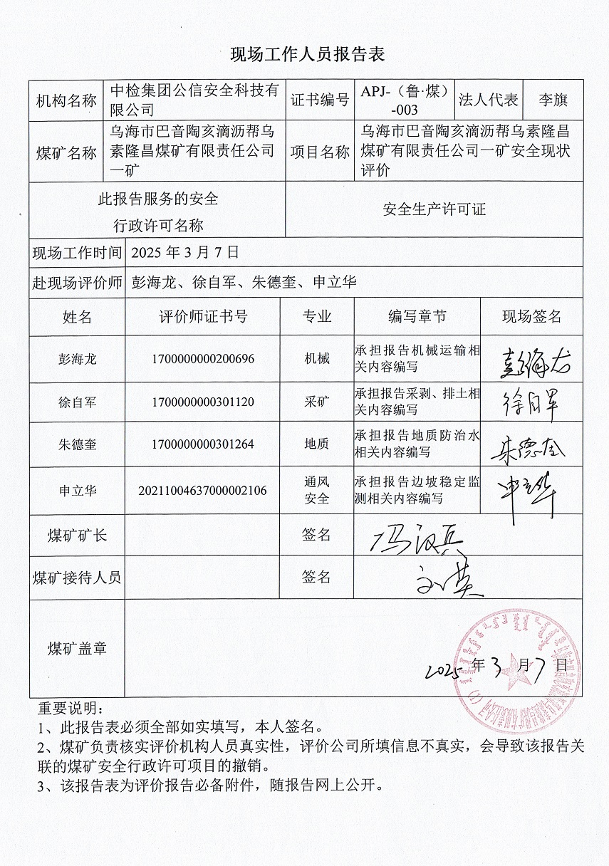 現(xiàn)場(chǎng)開(kāi)展安全評(píng)價(jià)工作的人員、時(shí)間及主要任務(wù): 彭海龍 徐自軍 朱德奎 申立華 于2025年3月7日到現(xiàn)場(chǎng)進(jìn)行調(diào)查、搜集資料,進(jìn)行現(xiàn)場(chǎng)評(píng)價(jià)。 于2025年3月9日到現(xiàn)場(chǎng)評(píng)價(jià)時(shí)存在的問(wèn)題進(jìn)行了復(fù)查。 2025年4月15日,烏海市應(yīng)急管理局組織專(zhuān)家對(duì)隆昌煤礦進(jìn)行了安全生產(chǎn)許可證發(fā)證現(xiàn)場(chǎng)核查,按照核查要求對(duì)報(bào)告內(nèi)容進(jìn)行了修改,出具此版《烏海市巴音陶亥滴瀝幫烏素隆昌煤礦有限責(zé)任公司一礦安全現(xiàn)狀評(píng)價(jià)報(bào)告》。 | |||||||