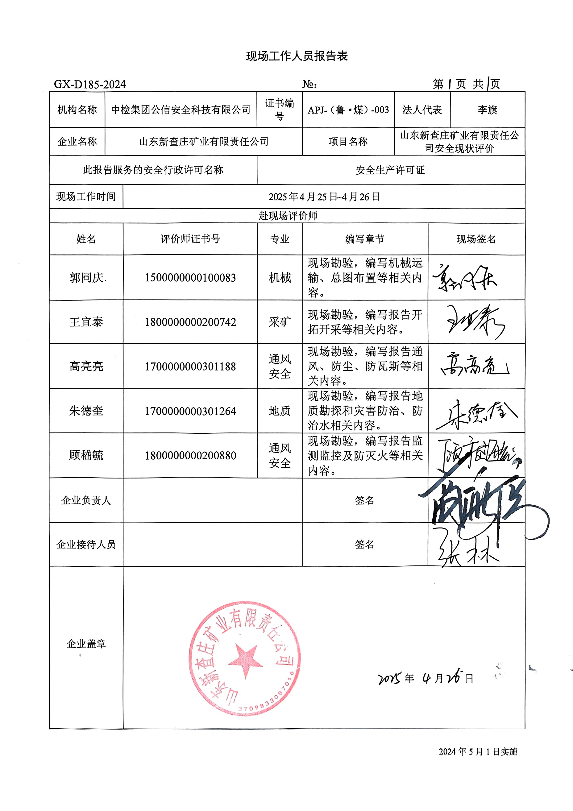 到現(xiàn)場(chǎng)開展安全評(píng)價(jià)工作的人員、時(shí)間及主要任務(wù): 人員:王宜泰、郭同慶、高亮亮、顧嵇毓、朱德奎 時(shí)間、任務(wù): 評(píng)價(jià)項(xiàng)目組于2025年4月25日~26日到現(xiàn)場(chǎng)調(diào)查、檢查;2025年5月17日編寫修改完善報(bào)告。 | ||||||