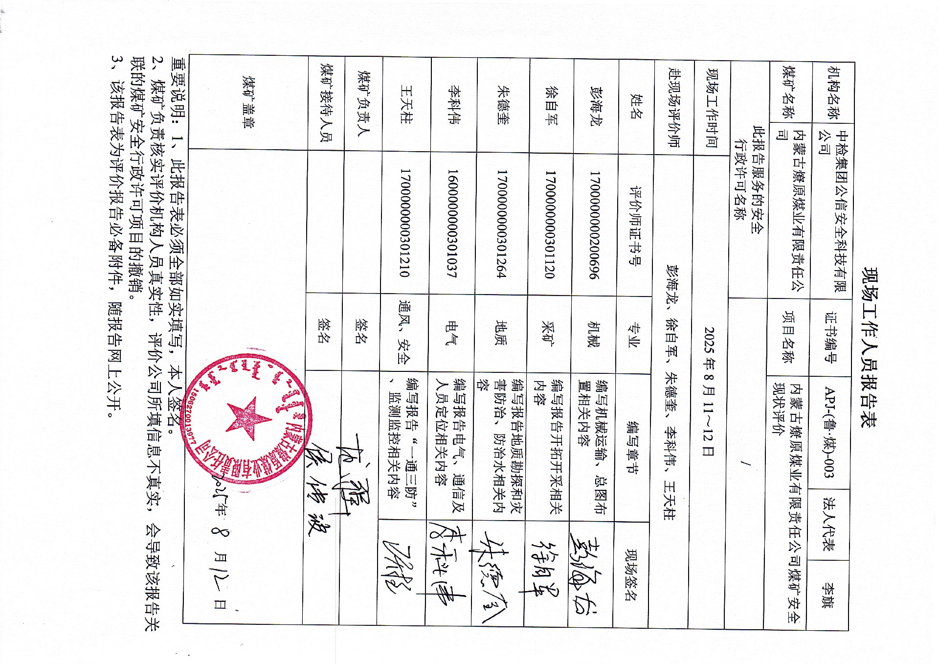 現(xiàn)場開展安全評價(jià)工作的人員、時(shí)間及主要任務(wù): 彭海龍、李科偉、徐自軍、朱德奎、王天柱于2025年8月11日~12日到現(xiàn)場進(jìn)行調(diào)查、搜集資料,進(jìn)行現(xiàn)場評價(jià)。于2025年8月17日到現(xiàn)場評價(jià)時(shí)存在的問題進(jìn)行了復(fù)查。 | |||||||