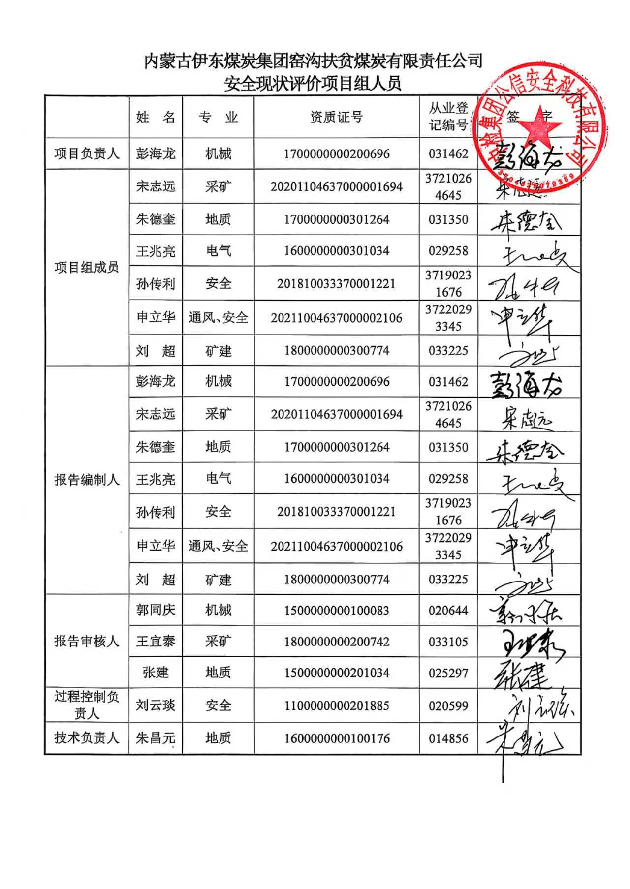 參與安全評價工作的安全評價師: 彭海龍 孫傳利 申立華 朱德奎 宋志遠 王兆亮 劉超 | |||||||