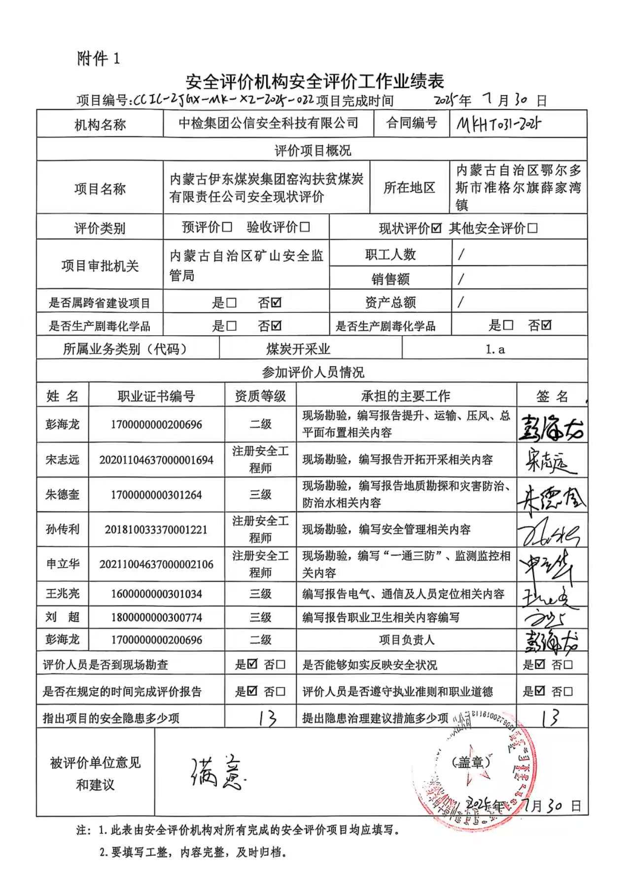 評價項目名稱 | 內(nèi)蒙古伊東煤炭集團窯溝扶貧煤炭有限責任公司安全現(xiàn)狀評價報告 | ||||||