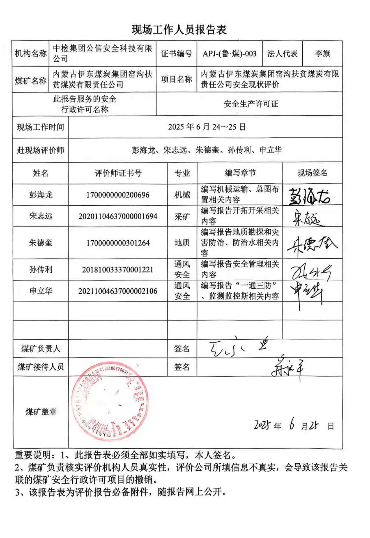 現(xiàn)場開展安全評價工作的人員、時間及主要任務(wù): 彭海龍 孫傳利 申立華 朱德奎 宋志遠于2025年6月24日~25日到現(xiàn)場進行調(diào)查、搜集資料,進行現(xiàn)場評價。 彭海龍 申立華 朱德奎于2025年6月15~27日對現(xiàn)場問題進行復(fù)查,礦方均已整改合格。 彭海龍 孫傳利 申立華 朱德奎 宋志遠 王兆亮 劉超 對報告進行了編寫。 | |||||||
