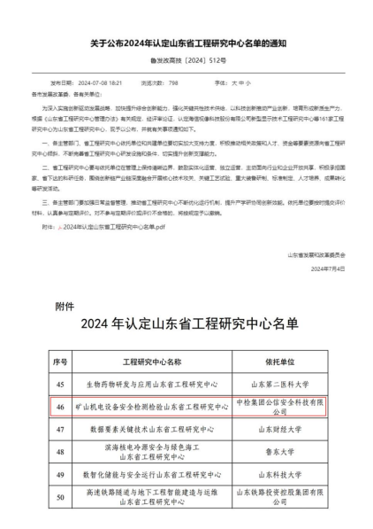 2024年7月4日,山東省發(fā)展和改革委員會(huì)公布了2024年認(rèn)定山東省工程研究中心名單的通知,依托中檢集團(tuán)公信安全科技有限公司申報(bào)的“礦山機(jī)電安全檢測檢驗(yàn)山東省工程研究中心”位列其中。山東省工···