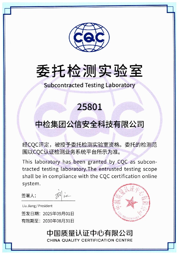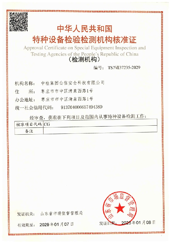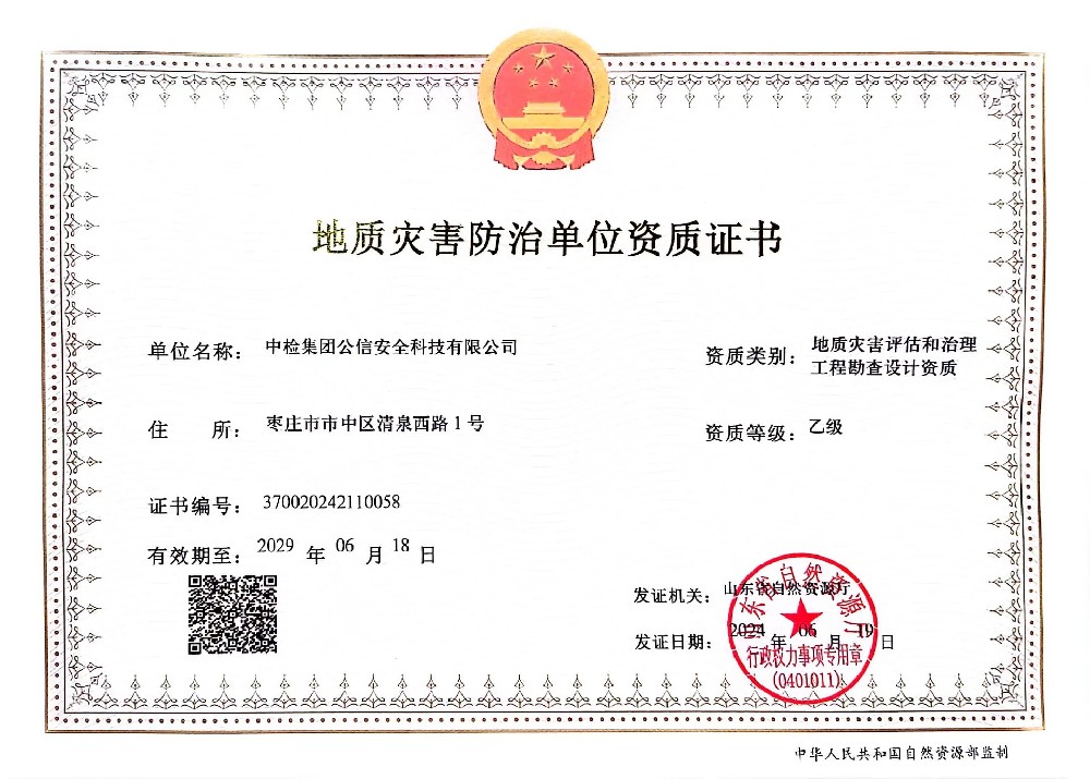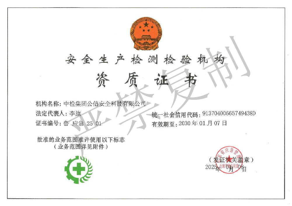 機(jī)構(gòu)名稱:中檢集團(tuán)公信安全科技有限公司證書編號:魯 應(yīng)急 25 01有效期至:2030年01月07日