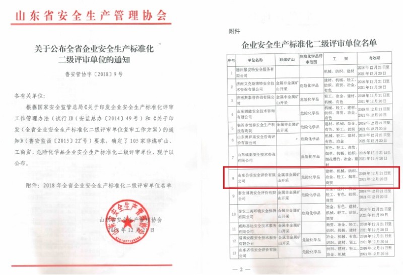 機構名稱:山東公信安全評價有限公司證書編號:ABPS-魯-2-025有效期至:2021年12月20日