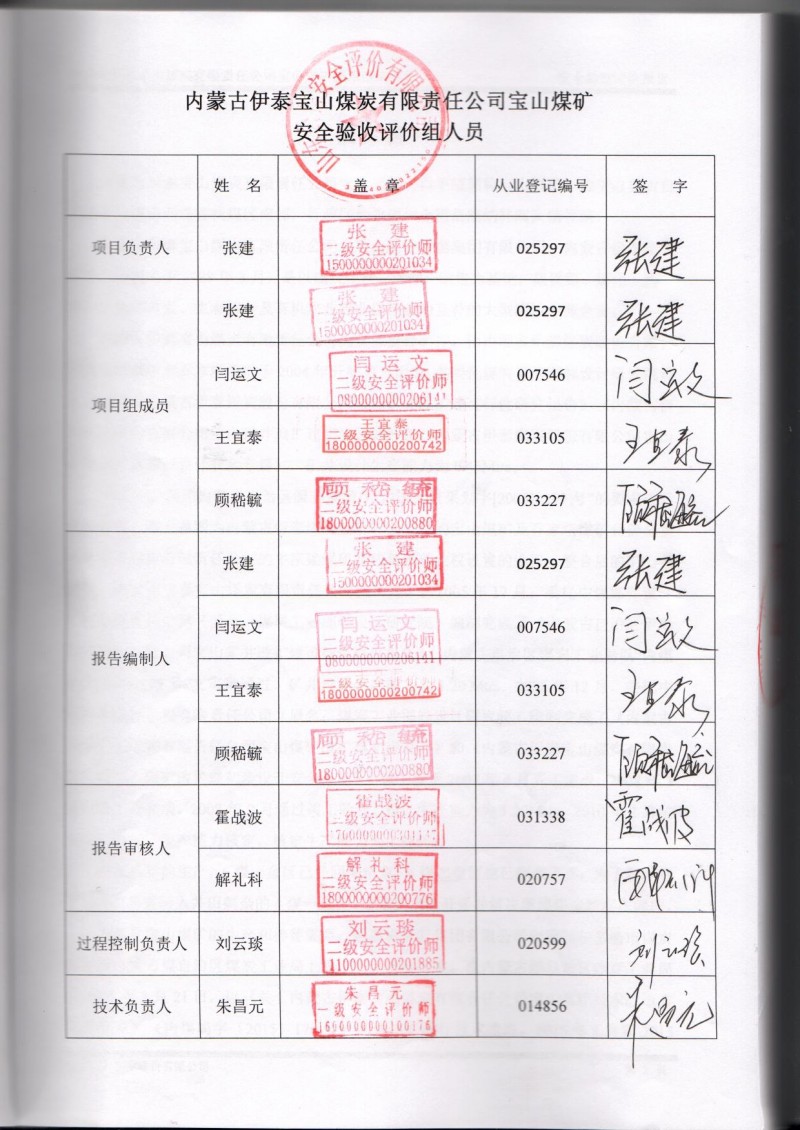 參與安全評價工作的安全評價師: 張建、閆運文、王宜泰、顧嵇毓 |