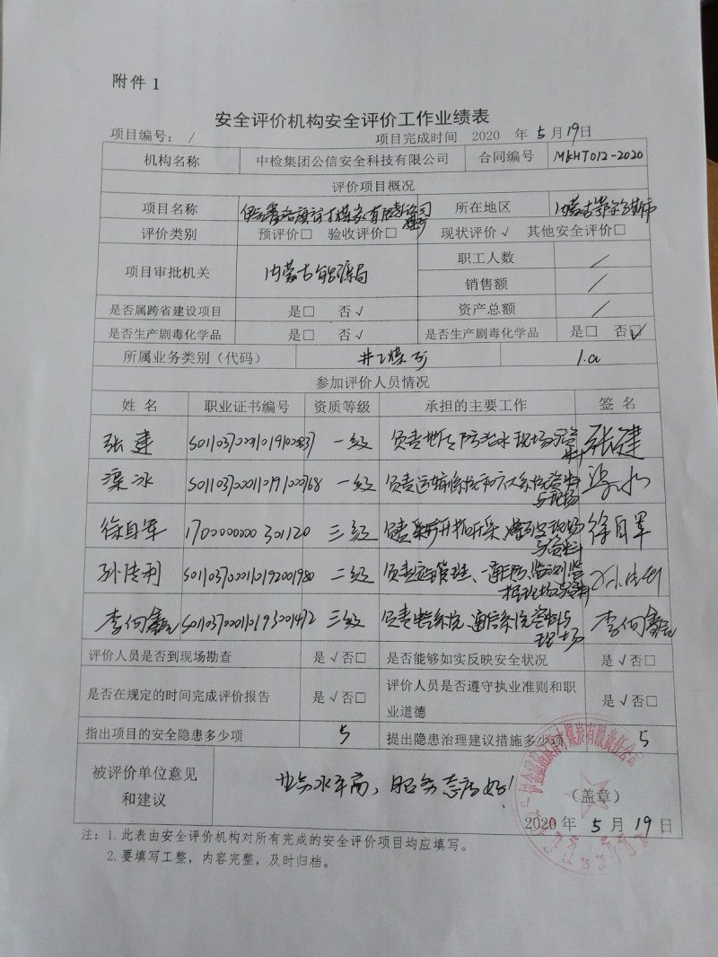現(xiàn)場開展安全評價工作的人員、時間及主要任務: 孫傳利 張 建 渠 冰 徐自軍 李向鑫 于2020年4月15~16日到現(xiàn)場進行調查、搜集資料,進行現(xiàn)場評價。 于2020年5月13日到現(xiàn)場對評價時存在的問題進行了復查。 |