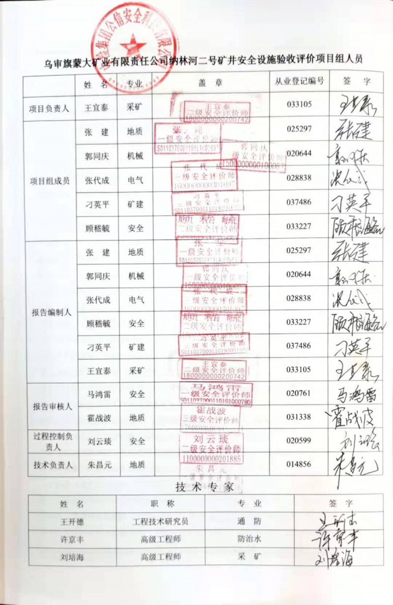 參與安全評價工作的安全評價師: 王宜泰、郭同慶、張建、刁英平、顧嵇毓、張代成 |