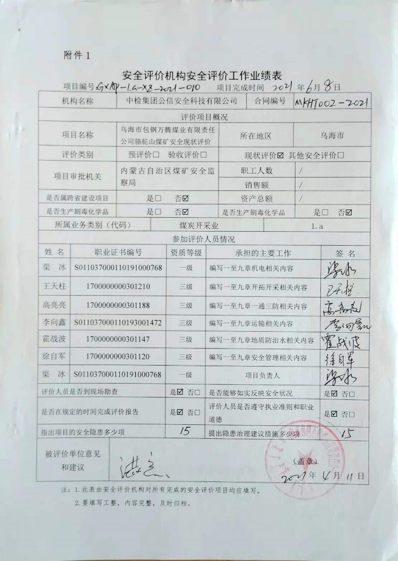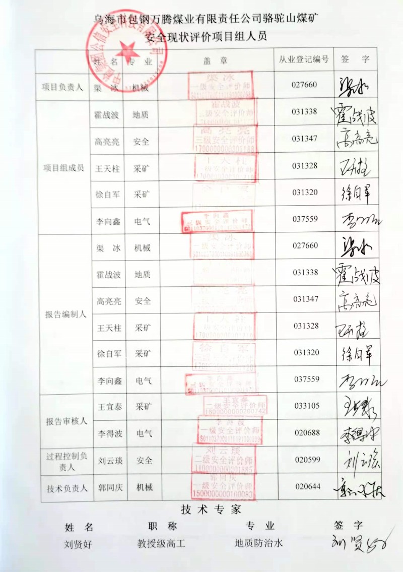 評價(jià)項(xiàng)目名稱 | 烏海市包鋼萬騰煤業(yè)有限責(zé)任公司駱駝山煤礦安全現(xiàn)狀評價(jià)報(bào)告 | ||||||