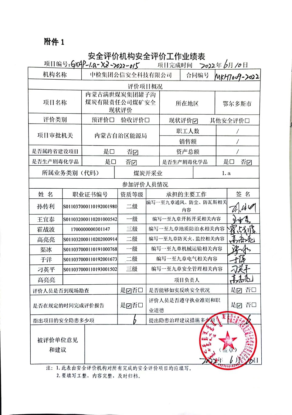 到現(xiàn)場開展安全評價工作的人員、時間及主要任務(wù): 人員:高亮亮、霍戰(zhàn)波、王宜泰、于洋、渠冰、刁英平、孫傳利 時間、任務(wù): 2022年4月30日-5月1日現(xiàn)場調(diào)查;2022年5月6日復(fù)查;2022年5月7日至2022年6月9日編寫修改完善報告。 |